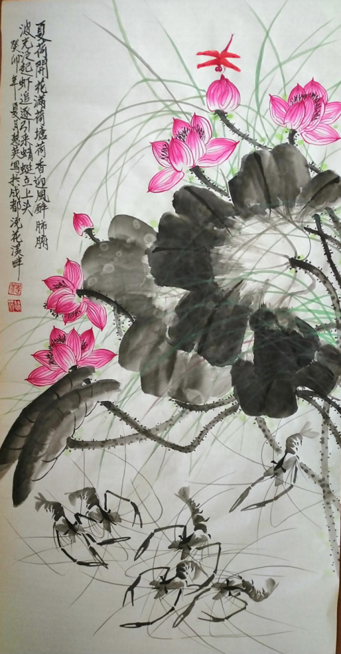 看蒋慧英女士的绘画作品,从虾趣图看到珠玑葡萄,从一池馨荷看到富贵当头,都有一种气韵生动的艺术魅力,画面质感特别干净,极是不落纤尘,一丝不苟的精湛。这难怪那么多的人喜欢看她的画,因为此种纤尘不染的画风,最能让人明心见性!