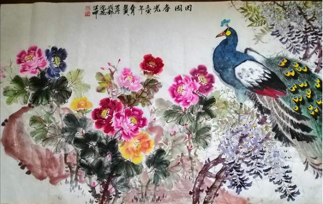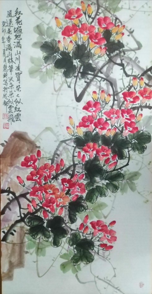 在当代画坛,中国画的画法有点儿乱糟糟的现象,一些人士画画有“乱涂乱抹”的习气,结果画出来的东西粗服乱头,不显雅观,没有赏心悦目的艺术属性。现在你去看蒋慧英女士的所有作品,都相当注意用心营造唯美的气氛,落笔定位准确,笔笔相生,笔笔到位,比如《花团锦簇满山川》这样的作品,既是执笔在手,运笔在心,心有竹成的塑造过程,所以画质天然,随心应手。